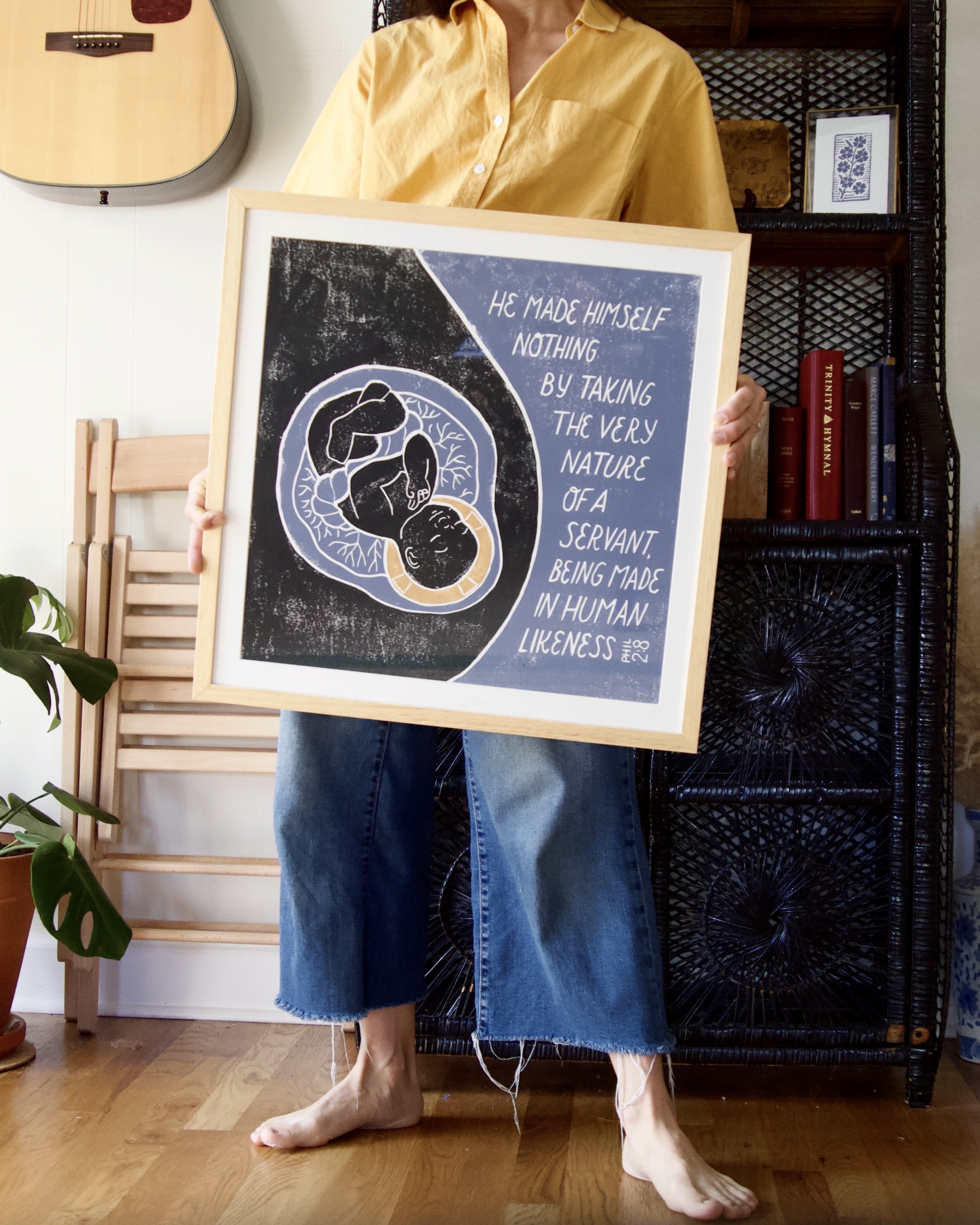 Holly is a self-taught printmaker specializing in the printing method known as “linocut.” After carving an inverse image of her design onto linoleum or rubber blocks, she rolls ink onto the surface of the blocks and presses paper down on them in order to transfer the image. Once Holly has carved a block, she can reuse it countless times to make multiple copies of the same design.